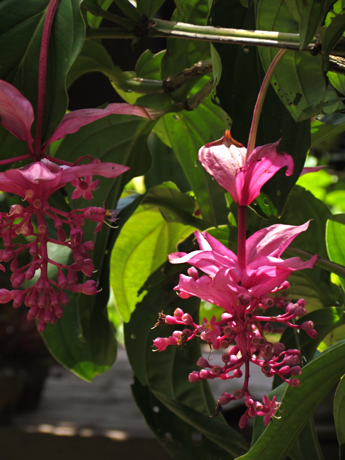 Over time, we have collected quite a substantial variety of medinillas; flowering tropical plants that popularly have pendulous, chandelier-like flowers that weigh down its woody, angular branches. It has rather stiff and leathery leaves, ribbed and pointed, or wavy in some kinds. Some have small (foreground below) or medium-sized leaves (left). The flowers first appear to be pale pink, but later blushes a more intense rose hue or mauvish-blue as it matures.